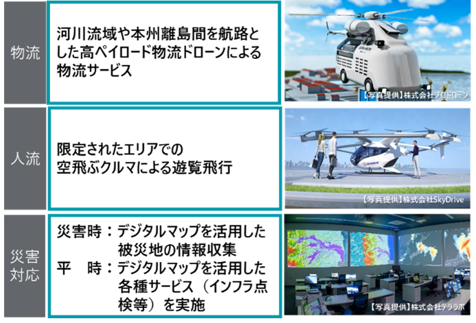 | 災害対応 | ・結成した「次世代空モビリティ災害対応チーム」の運用検証 ・平時の公共インフラ点検等の実証実験 | ・災害時の広域情報収集や市町村へのドローン派遣などの支援活動を行う「次世代空モビリティ災害対応チーム」を結成 |