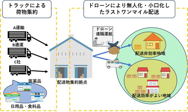 新城市ではトラックで荷物の集約拠点まで配送し、ドローンにより無人化・小口化したラストワンマイル配送を行う。