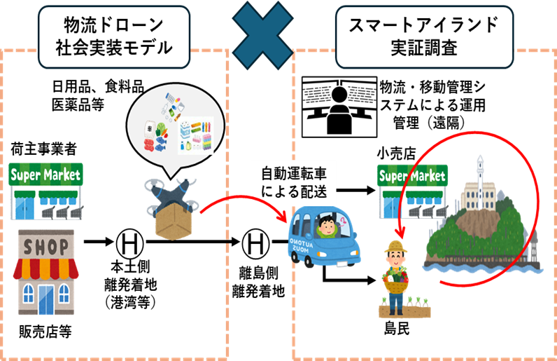 企業向けの定期配送に加え、オンデマンドによる個人向けの配送を組み合わせることで、飛行回数の安定化と島民への新たなサービス確立を目指す。また、自動運転車(スマートアイランド推進実証調査業務(※3))と連携することで無人化されたラストワンマイル配送を検証する。