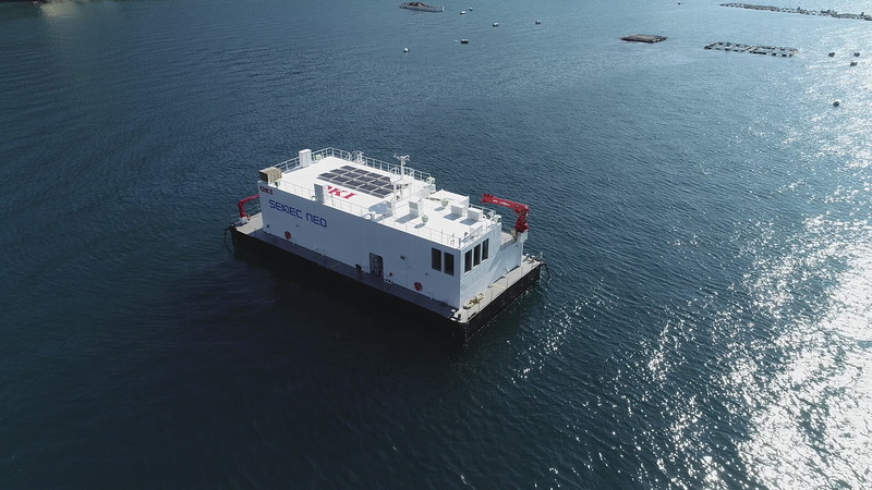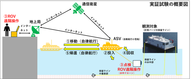 AUVの社会実装に向けた最初の段階として、ASVとROVを用いて将来のAUV化を想定した実証試験を海上で行う。浮体式洋上風力発電設備に見立てた観測対象(OKIが所有する計測バージ「SEATEC NEO」係留ライン)の水中データを無人で取得する技術の有効性を確認する。