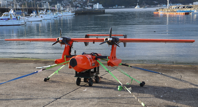 実験で活用したUAVは、ハマが開発した飛行艇型UAV「HAMADORI6000」の新モデル。翼幅6.3mのボディにガソリンエンジンを搭載し、機体の大型化を実現しながら90km/h以上の速度で330kmの飛行が可能となった。観測機器(ペイロード)の一部は、民生用ドローンで一般的に採用される非測量用機器を利用し、コストを低減している。