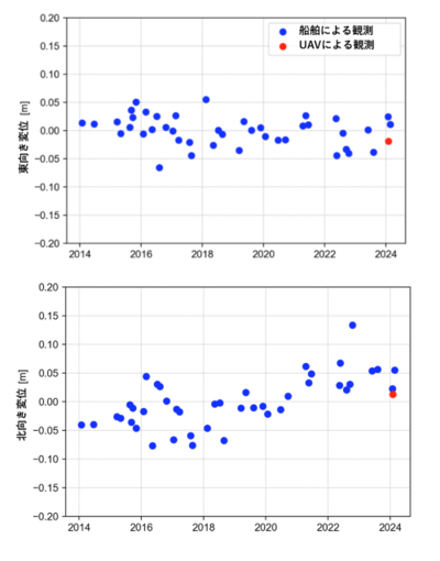次に、相模湾でUAVを用いた海底位置計測実験を行った。大きな波や風のない理想的な環境で実施した結果、海底位置がセンチメートル精度で特定できることを実証した。この結果により、船舶を使用せずに低コストかつ迅速に海底の位置を測定できることが示唆され、地震発生直後の迅速な海底変動の把握や、より頻繁な長期モニタリングへの応用が期待される。