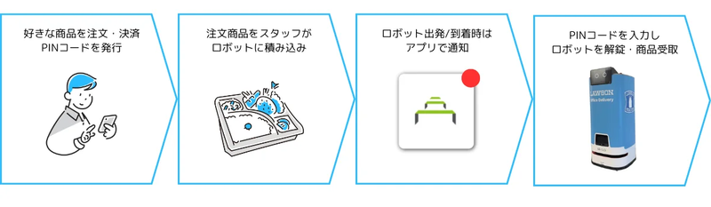 このデリバリーサービスでは、ローソンで取り扱う商品をモバイルオーダーから決済し、配送ロボットによる社内各所への自動配送までをワンストップで提供する。