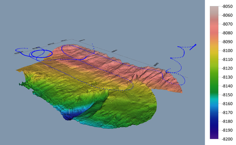 伊豆・小笠原海溝の深度約8,000mから取得した地形データ(速報値)。青線は、「うらしま8000」の航跡