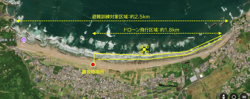 写真:海岸の空中写真に示された、避難訓練対象区域、ドローン飛行区域、離着陸場所