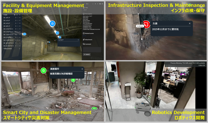 設備・施設管理やインフラ点検、ロボティクスシミュレーション、スマートシティ構想など幅広い分野に対応。軽快に動くフォトリアル3D表示、Kudanの空間知覚技術とAIによる自動処理により、管理対象の分類・タグ付け・解析まで一気通貫で実行する。これにより、直感的なデータ管理、情報連携、自動化による業務効率化とサービス品質の向上を実現する。
