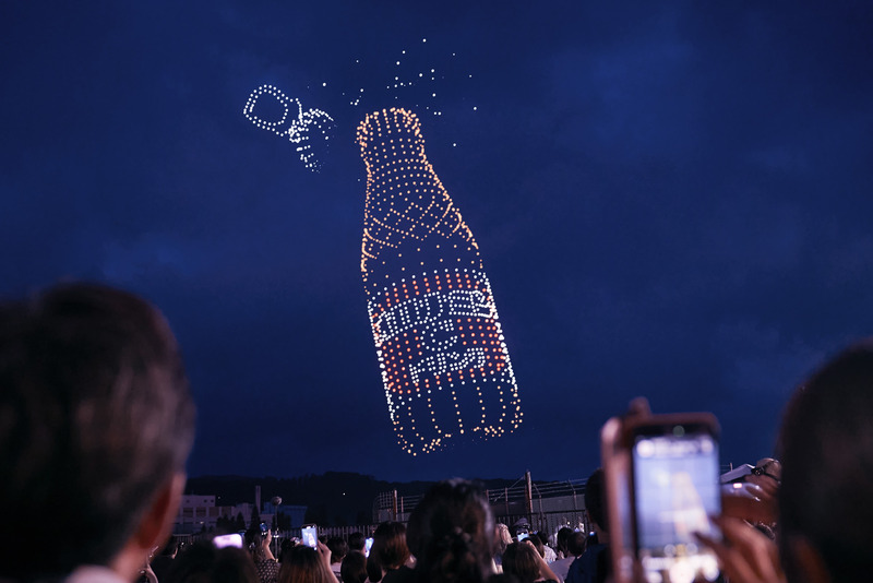 写真:ドローンショーで夜空に描かれたオロナミンCドリンク