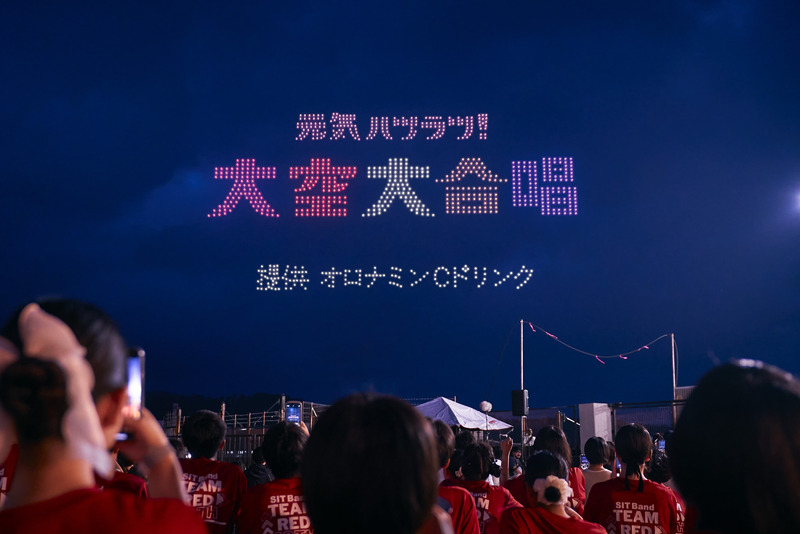 約1,300機のドローンが夜空に歌詞や五線譜、オロナミンC型の音符を描き出し、来場者とともにシンガーソングライターKANさんの名曲「愛は勝つ」を合唱するというコンセプト。縦約225m、横約65mの巨大オロナミンCも夜空に浮かび上がる。