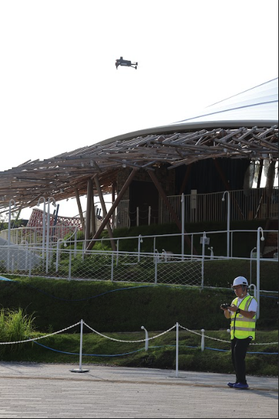 写真:万博会場内を飛行するドローン、操縦者