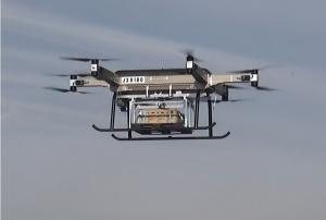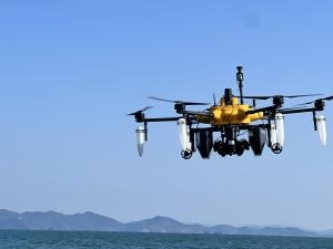 滑走路を用いない、開発中の防水段ボール製VTOLドローンが湾内を旋回する。