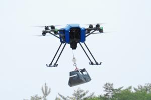 可搬型FC発電機の中継地点までの配送等、山頂までのリレー方式での資材搬送を想定した飛行を実演。