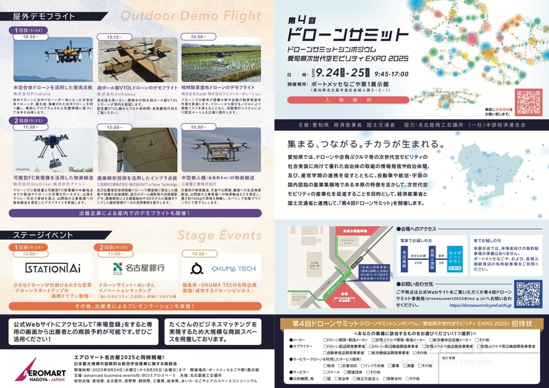 2025年8月19日、愛知県は、2025年9月24日・25日に開催する「第4回ドローンサミット」で実施するプログラムを発表し、特設サイトで来場者の募集を開始した。