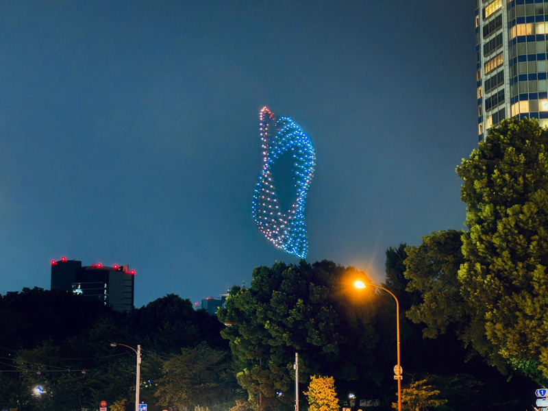 今回のテーマとなった楽曲はアゲハライド代表のKenn Kato氏に縁のある和太鼓集団「梵天(BONTEN)」の「D.N.A」と「Hiten」の2曲。WebX2025の1日を締めくくるパフォーマンスとしてLIGHTDANCeを上演し、300機のドローンが音楽とシンクロしながら、あやとりや折り紙などの日本文化をあらわす光の演出で東京の夜空を彩った。