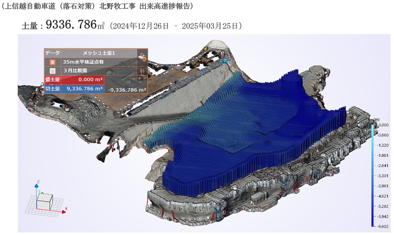 掘削量を定量的に管理しながら、安全かつ効率的に進めていく必要があり、従来は、搬出する掘削土の質量をトラックスケールで計測し、その値から体積を推定しているが、精度の高い進捗管理には多くの手間や調整が必要であった。測量による管理も可能だが、掘削面は日々変化するため、定期的な現場測量は時間と労力の負担があり現実的ではない。