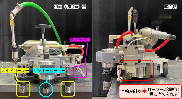 そこで、新設橋梁や造船の工場製作時に使われているコンプレッサーを動力としたエアー式自走面取り機に着目して、桁幅の変化や桁の厚みの変化に対応できるよう機械を改良し、開発を進めてきた。