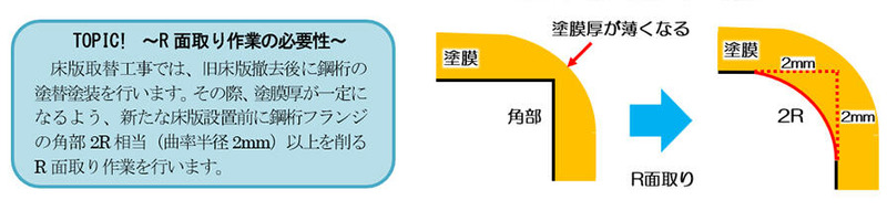 床版取替工事では、旧床版撤去後に鋼桁の塗替塗装を行う。その際、塗膜厚が一定になるよう、新たな床版設置前に鋼桁フランジの角部のR面取り作業を行う必要がある。従来は複数の作業員がディスクグラインダー等を用いて作業を行っており、切創リスクの低減や効率化・省人化が課題となっていた。