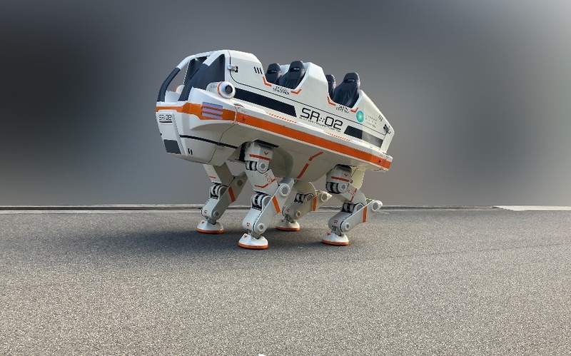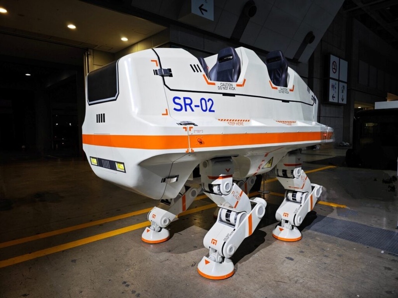 SR-02は、4足歩行により移動する乗り物(ライド)で、主にエンターテインメント用途のロボット。現在開発されているプロトタイプ機は、全長が約3.6m、全幅約2m、全高約2.7m(歩行時)となっており、4人が搭乗して歩行移動ができる。従来から、歩行(前進・後退・右左折)をはじめ、人が乗降するための屈伸動作、ローリング、ピッチングなどができたが、今回、三精テクノロジーズとアスラテックが協力し、前かがみの姿勢(前屈)と、頭を上げた姿勢(後屈)の新モーションを追加した。