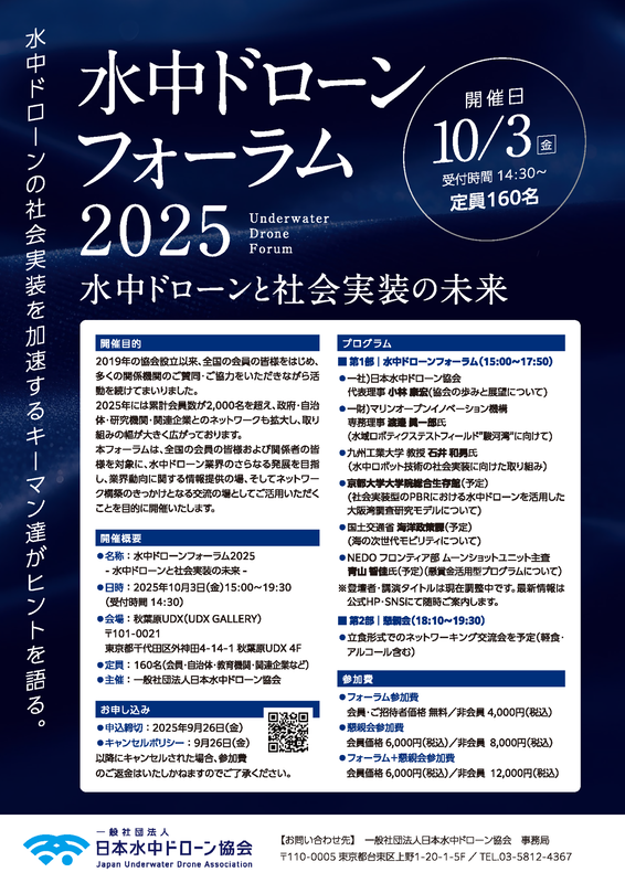 日本水中ドローン協会は、全国の会員や業界関係者が一堂に会するリアルイベント「水中ドローンフォーラム2025 ― 水中ドローンと社会実装の未来 ―」を、2025年10月3日に秋葉原UDXで開催する。水中ドローン分野のキーマンによる講演や最新事例を共有し、ネットワーキングの場を通じて技術革新と社会実装の加速を目指す。
