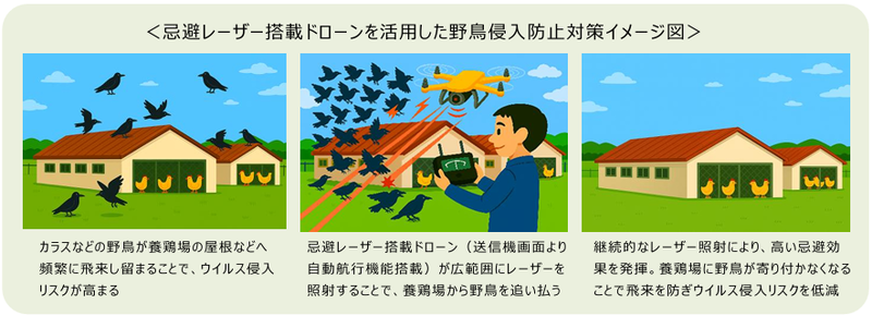 忌避レーザーを搭載したドローンは実証に基づいた効果が期待されており、養鶏場への野鳥の侵入を防ぐことで鳥インフルエンザの発生を未然に防ぐ。
