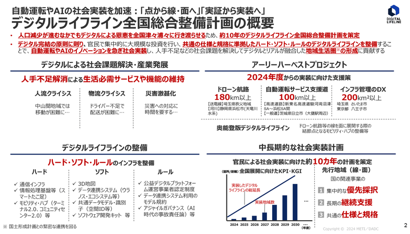 日本では人口減少が進み、地方を中心に生活必需サービスの維持が課題となっている。こうした課題を自動運転やドローンなどのデジタル技術を活用して解決するため、国は2024年6月に「デジタルライフライン全国総合整備計画」を策定。デジタル技術を活用したサービスの社会実装に必要な社会インフラを今後10年で全国に整備する方針だ。