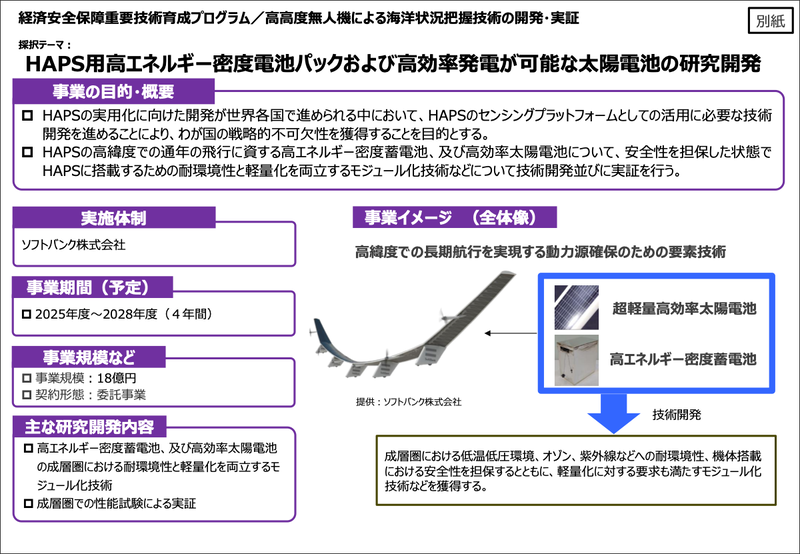 2025年10月6日、NEDOは、「経済安全保障重要技術育成プログラム」(以下、K Program)の一環で実施する「高高度無人機による海洋状況把握技術の開発・実証」において、無人機が成層圏に長時間継続的に停留して通信を提供する高高度プラットフォーム(HAPS)によるセンシングを実現するため、無人機の成層圏長期航行を可能にする動力源の開発に着手すると発表した。実施予定先はソフトバンク。期間は2025年度から2028年度までを予定しており、予算は18億円。