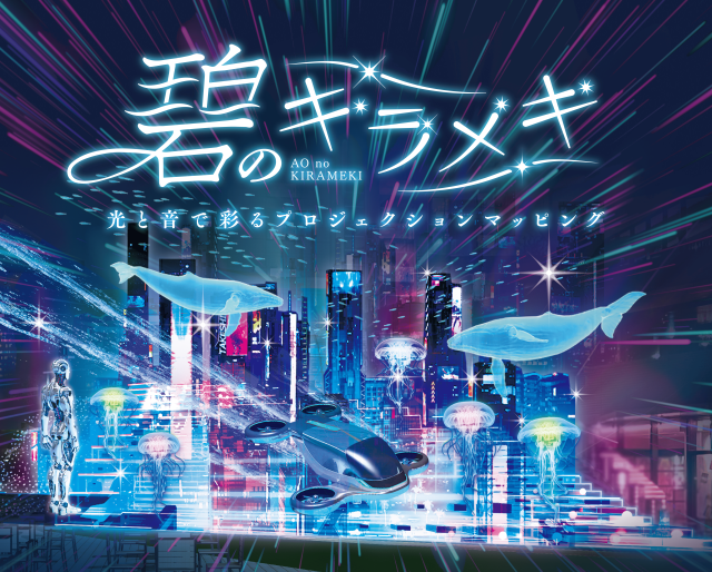 プロジェクションマッピングによる光と音の演出で、大階段に「碧の世界」を映し出す。コンセプトは「Future x Flow」。光・色・波・粒子で「水の流れ」「情報の流れ」「人の流れ」を表現する。毎時00分、20分、40分には特別映像を投影する。