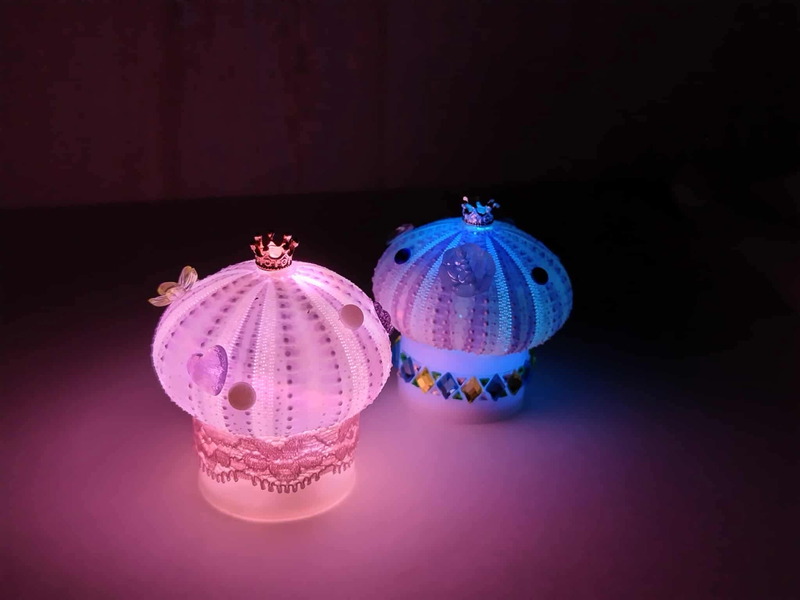 本物のウニの殻を使った「KOKOPELLI+」発案の人気オリジナルワークショップ。ウニの殻をはじめ、サンゴや貝殻など海からの自然産物を中心に使いながらLEDランプを作る。