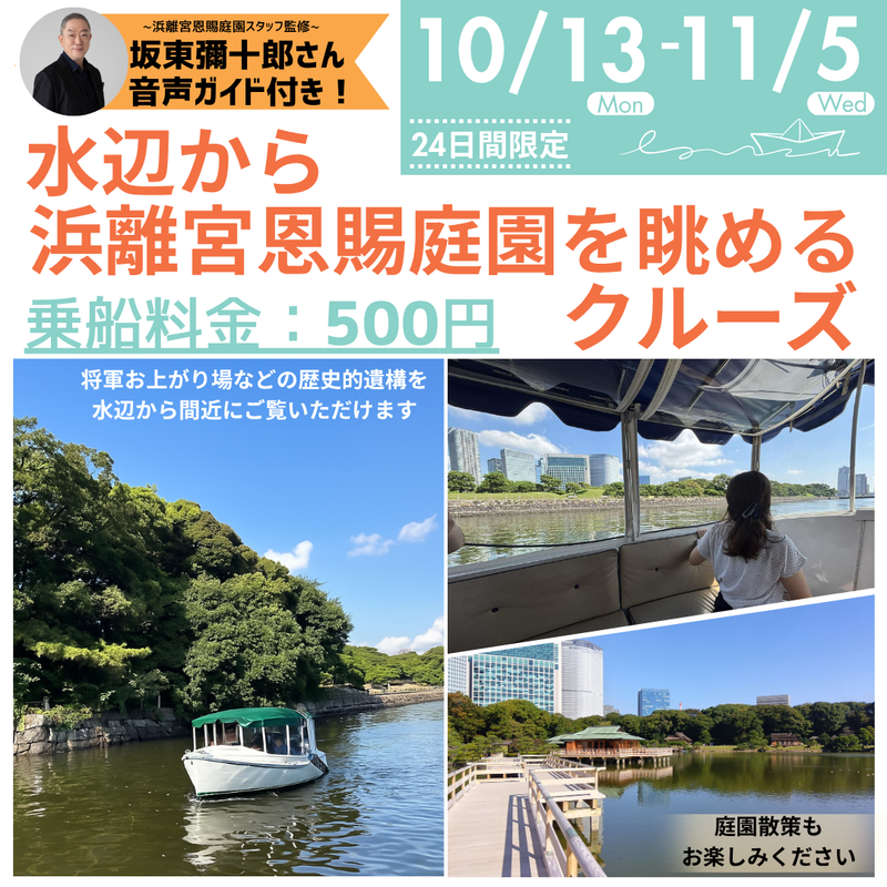 電動船に乗って浜離宮の景色や歴史を感じるクルーズ。浜離宮の「将軍お上がり場」などの歴史的遺構を水辺から間近に見ることができる。浜離宮恩賜庭園スタッフ監修、歌舞伎俳優の坂東彌十郎さんによる特別音声ガイド付き。
