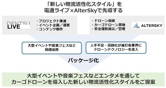2025年10月23日、電通ライブは、SkyDriveの関連会社であるAlterSky、PYRAMID GARDEN実行委員会と、新たな物流スタイルとして注目される「カーゴドローン」に焦点を当てたプロジェクト「BLUE SKY LIVE」を始動し、社会実装に向けた実証実験を開始したことを発表した。