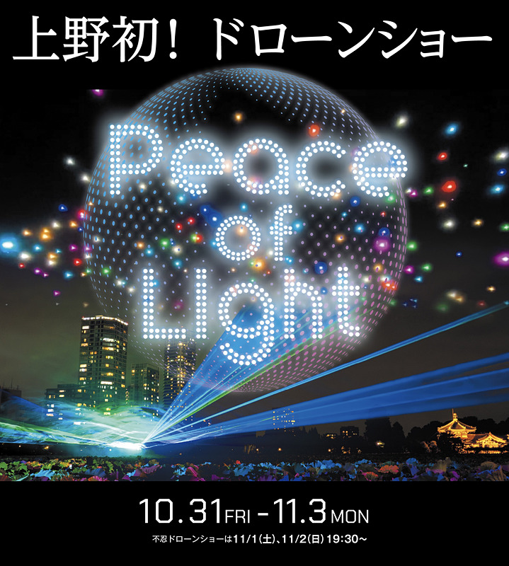 2025年10月31日~11月3日に上野恩賜公園・不忍池エリアで開催される光と音のアートフェスティバル「Peace of Light(ピースオブライト)」の期間中に行うもので、平和を願う「天空の上野物語」を400機のドローンが夜空に描く。