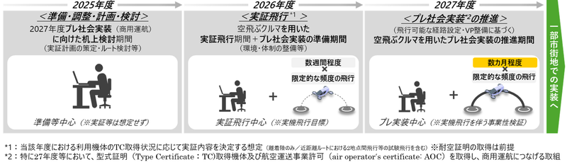 2025年度からの3か年は、「準備・調整・計画・検討」「実証飛行」「プレ社会実装の推進」期間と位置づけ、同コンソーシアムと東京都が連携し、臨海部エリア・河川上エリア(空港へのアクセスを想定)での飛行を目指す。また、運航環境の整備(離着陸場や拠点の確保・整備、管制・通信システムの調整など)、運航支援、評価・検証を実施することで、速やかな事業展開ができる体制構築にも取り組む。