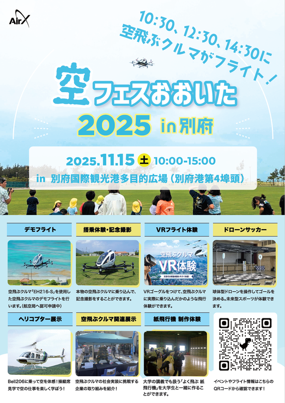 大分県は、2025年11月15日、空飛ぶクルマなど空のモビリティを“見て、触れて、体験”することで身近に感じるイベント「空フェスおおいた2025 in 別府」を開催する。