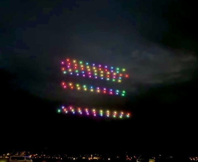 写真:ドローンの光で夜空に描かれた「Thank you」や星、ハートなど