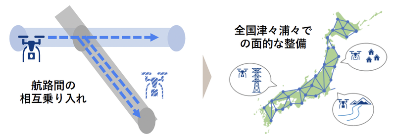 これらのガイドライン等に準拠したドローン航路を認定・認証する「ドローン航路登録制度」の実証を進める。