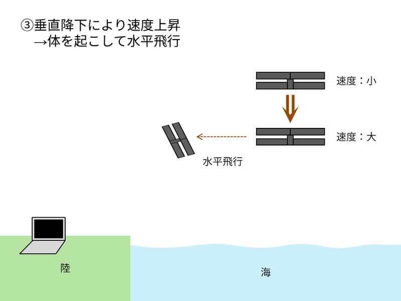 3. 垂直降下させて速度上昇した後、体を起こして水平飛行