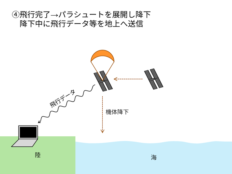 4. 飛行完了後、パラシュートで降下しつつ飛行データ等は地上へ送信