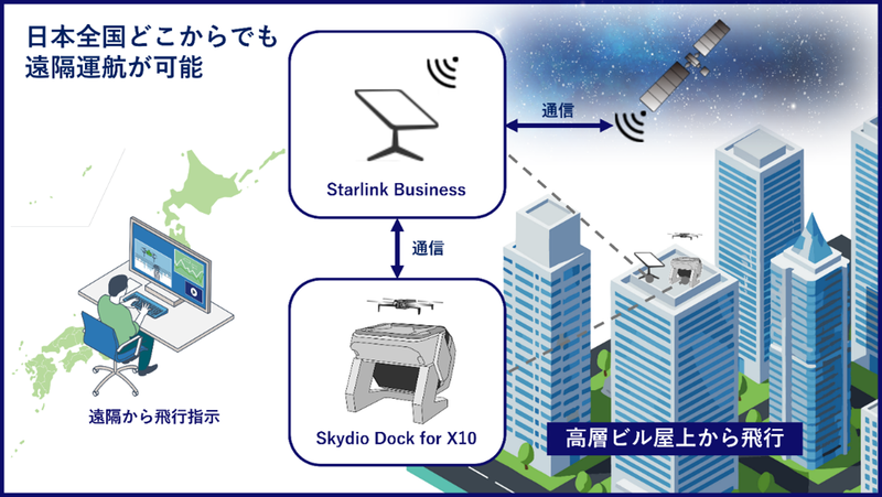 この実証では、首都直下型地震などの大規模災害発生時を想定し、自動充電ポート付きドローン「Skydio Dock for X10」、衛星通信「Starlink Business」を屋上に設置。屋上から自動離陸・着陸や広域映像の撮影を行い、有事における日本橋周辺エリアでの情報収集の有効性を検証した。
