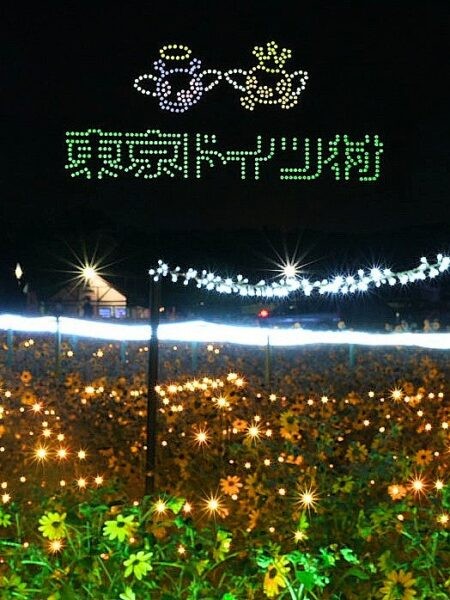 写真:ドローンショーで夜空に描かれた東京ドイツ村のキャラクター、「東京ドイツ村」
