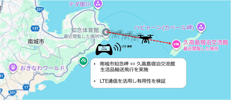 緊急時の物資や、離島生活の必要在庫で使用頻度が低い高価な薬品などをドローンで輸送することで、離島住民の生活利便性の向上を目指す。技術的な面では、ドローンの送信機(コントローラー)の電波が届かない距離でも、LTE通信による遠隔操作・運航管理が有用であるかを検証した。
