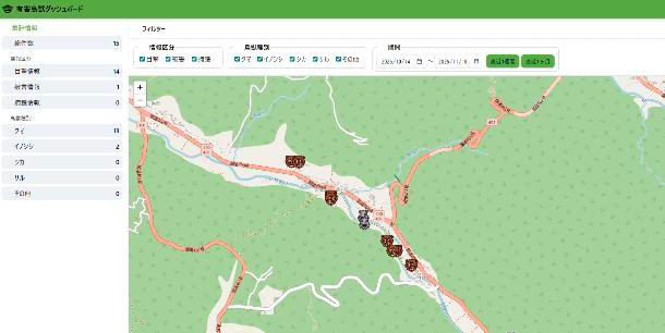 ③ 出没ポイントを有害鳥獣ダッシュボードへプロットし、村内の情報共有を強化