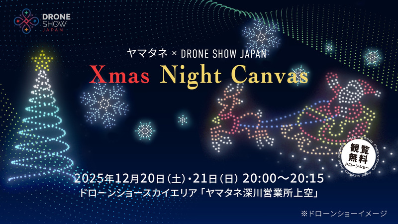 ドローンショー・ジャパンとヤマタネは、既存の業務提携を拡大し、東京都江東区越中島のヤマタネ深川営業所管内の空域を活用したドローンショーを開催する。今後、2026年にかけて計10回の実施を予定しており、その第1弾として、2025年12月20日・21日に「ヤマタネ・DRONE SHOW JAPAN・Xmas Night Canvas」を開催する。