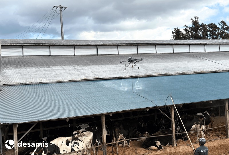 2025年12月10日、デザミスと宮城県酪農農業協同組合(以下、宮城県酪)は、酪農現場における暑熱ストレスの軽減と生乳生産量の安定化を目的に、「酪農施設暑熱対策緊急実証事業」のモデル施工を行ったと発表した。宮城県内の6つの牛舎において、ケルヒャージャパンとスカイコードが共同開発した高圧洗浄ドローンを活用し、効率的な暑熱対策の有効性や現場導入に向けた運用面の確認を行った。