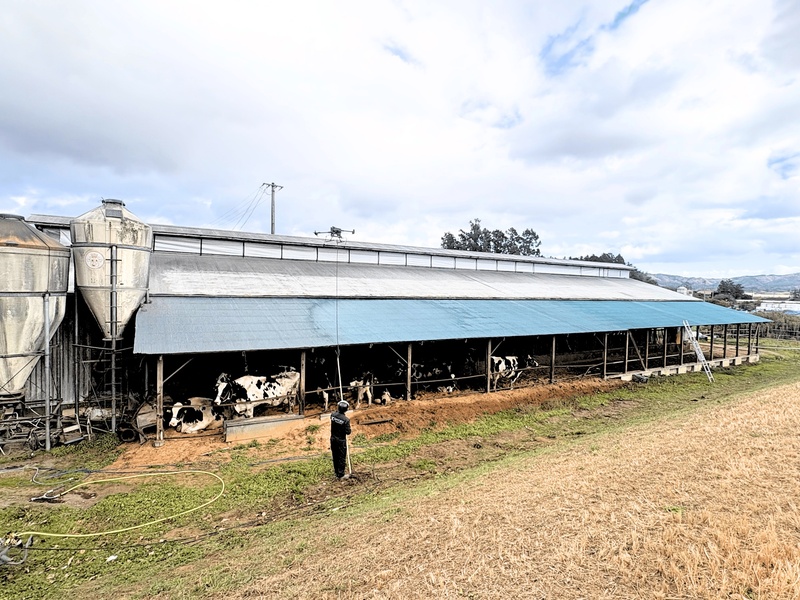 ドローンを活用して牛舎の屋根に耐久性のある遮熱剤を塗布することで、牛舎内の温度上昇や夏場の生乳生産量の減少幅を抑えるとともに、繁殖成績の向上を目指す。