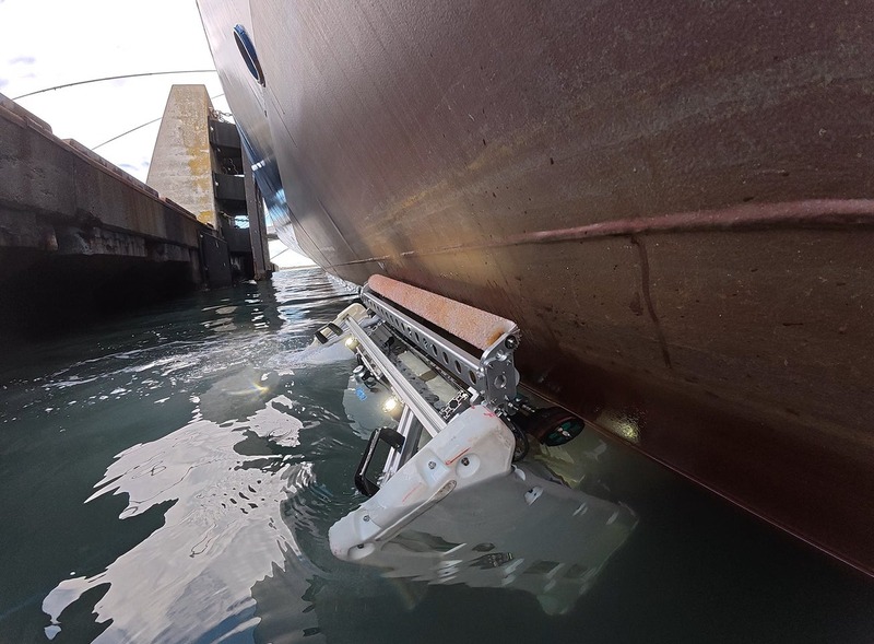 写真:ロボットが船底を清掃する様子