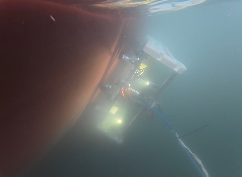 写真:水中の船底を走行するロボット