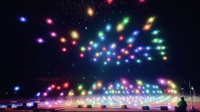 カラフルな光りを放つ複数のドローンが離着陸する様子