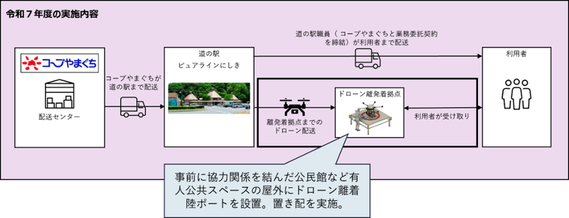 そこで、山口県全域で宅配事業を展開するコープやまぐちと、道の駅を運営する錦町農産加工が協力し、岩国市や社協、AlterSkyと連携する体制により、道の駅や公民館等の拠点、ドローン配送等の物流効率化技術を活用することで、地域住民の食品・日用品・医薬品等のアクセスを改善し、流通量の増加を目指す。