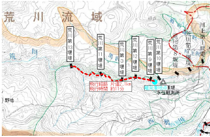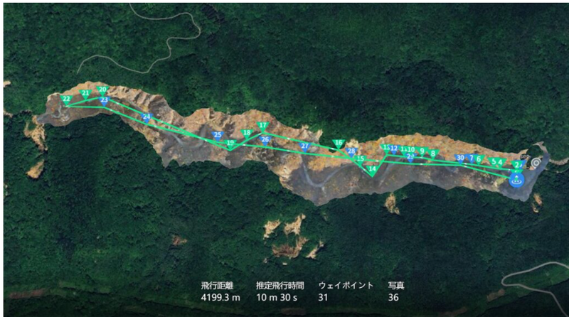地図に示されたドローンの飛行経路と飛行時間