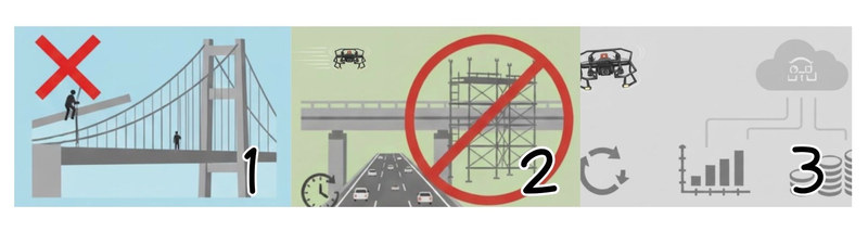 従来は足場の組み立てと撤去に約1週間を要していた橋梁点検工程を、ドローン運用により不要化。準備や復旧にかかる時間・労力を大幅に削減した。 - 撮影データを活用し、点検履歴のデジタル資産化を推進