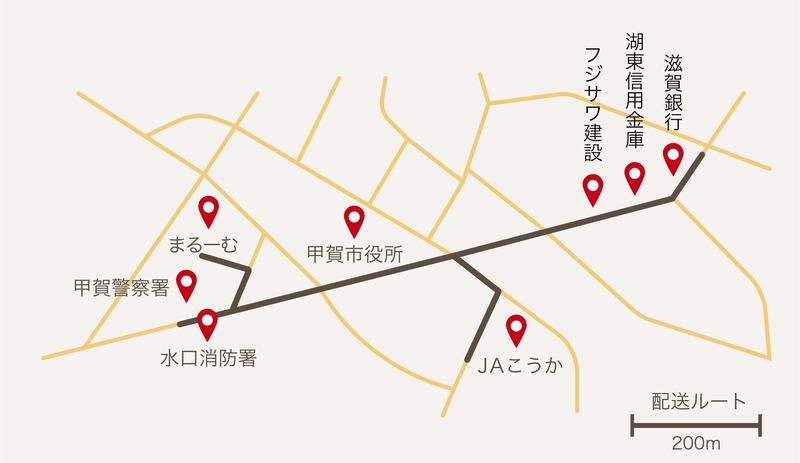 実証では、JAこうかを拠点として、甲賀市役所を中心とした約3kmのルートを自動配送ロボットが走行する。JAこうかで弁当を積載して各拠点へ自動配送を行う。
